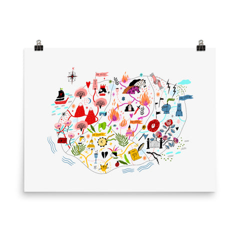 The Kingdom Map was designed by Romanian illustrator Madalina Andronic, who also designed all the album covers along the Queens of Heart release journey. In her grand finale, Madalina filled each kingdom with images inspired by the lyrics of the songs in that particular part of the story. For example, in the kingdom of Act I: The Kiss, you can see a ship sailing in from sea, a treasure box, a red-hot heart and snow-capped mountains. Own this Kingdom Map and you will keep the magic of the Queens of Heart story close at hand.